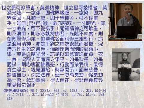 為什麼我從前面徹悟禪師他對精神那種珍重,跟對時間那種愛惜會這麼深的體會,主要就是在這裡讓我看到一句話,這句話很重要喔,他說怎樣? 延一念為長劫,促長劫為一念,在來下面那句,念劫圓融對嘛,到這句就好,延一念為長劫,促長劫為一念,念劫圓融,這句話很重要,他念佛念到怎樣呢,念到前面這兩句都怎樣?圓融你知道嗎?我們念佛啊!念佛歸念佛,時間規時間,兩個都怎樣?不會碰頭,他不但兩個碰頭而且怎樣? 圓融,圓融到什麼程度,我剛才也講他的佛念就是他的性命對嘛,真正做到,他念佛的時候就怎樣?就是在念他的性命的時候,這種念佛最高明你知道嗎?我們不是,有的人用他的體力去念,用他的喉嚨去念,這都不是,他用他的性命去念佛,所以他可以做到延一念為長劫,我們剛才有講過,既然念跟劫它能夠圓融,就是你的精神跟時間能夠圓融,時間抓到我們的心念,是不是就是抓到時間,是啊,對,所以呢,他念佛雖然是大海上面的一波,但是它能夠抓到這波時就抓到大海,對嘛,所以他每一念呢,都很徹底啊! 所以他能延一念為長劫。